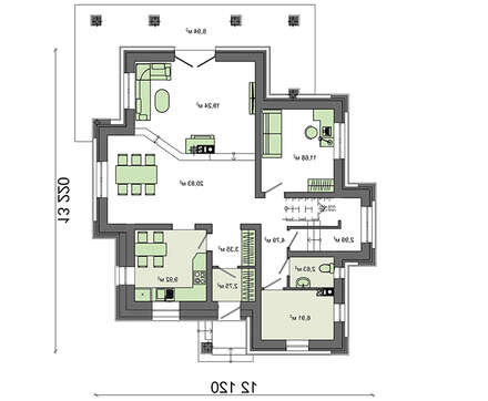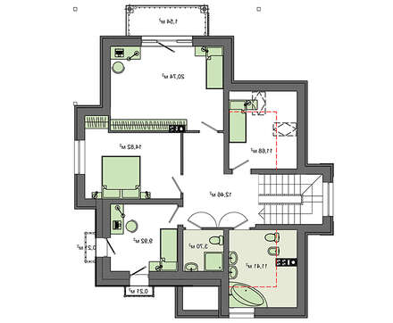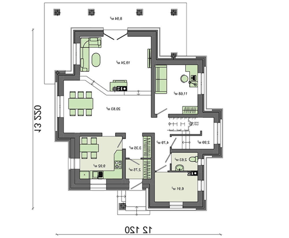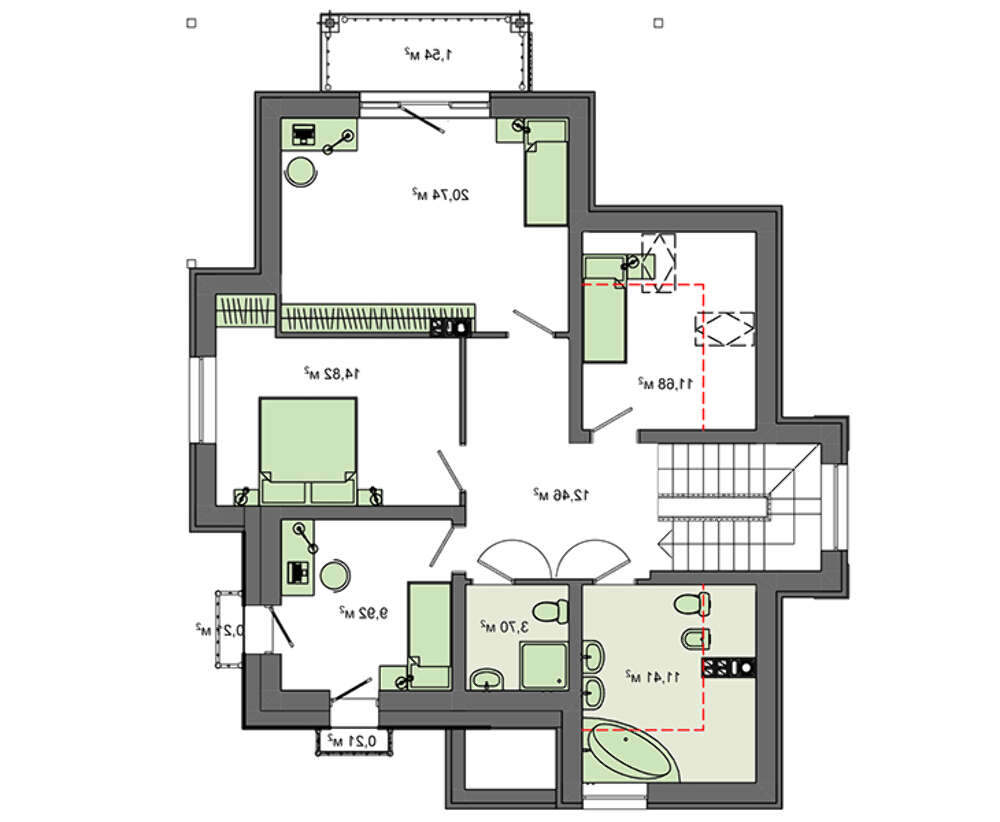 Внутренняя планировка, как присуще романскому стилю, напрочь лишена симметрии. Все положено на алтарь основательности и практичности. В планировочных решениях наблюдается некая величественность. Помещения большие и просторные. Гостиный зал на первом этаже за счет объединения зоны отдыха, столовой и кухни собрал площадь более 50 кв. м.