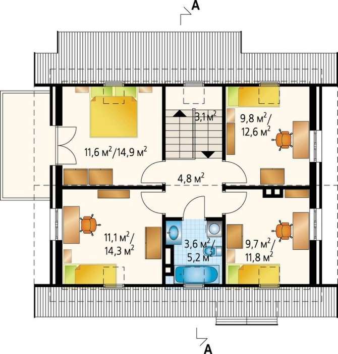 Эффектный дом с мансардой в немецком стиле понравится людям, предпочитающим все яркое и броское. Проект может быть использован как в качестве городской застройки, так и для дачного жилья. Несмотря на компактные размеры, дом довольно вместителен и содержит все необходимые помещения для проживания большой и дружной семьи из 5-6 человек.