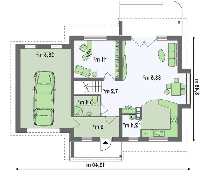 • 4M013G Проект аккуратного загородного одноэтажного дома с мансардой и гаражом для автомобиля