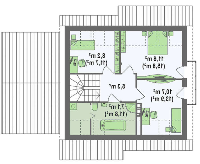 Проект аккуратного загородного одноэтажного дома с мансардой и гаражом для автомобиля
