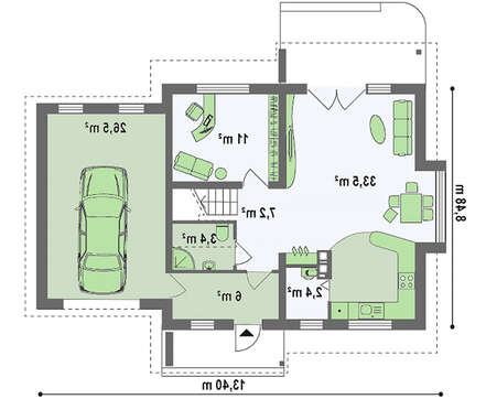 Проект аккуратного загородного одноэтажного дома с мансардой и гаражом для автомобиля 4M013G