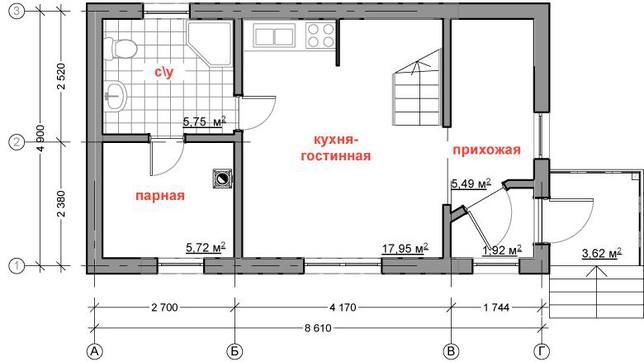 Проект содержит три раздела – Архитектурный, Конструктивный и Инженерный: водоснабжение, отопление, вентиляция, канализация, электроснабжение (приобретается за дополнительную плату) + Пояснительная записка.