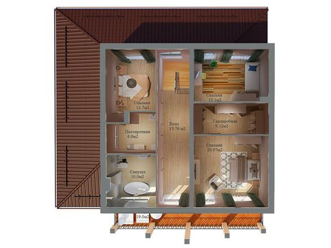На первом этаже находятся помещения для дневного времяпрепровождения. Основную площадь занимает зал в 47 кв. м., полученный за счет объединения гостиной, столовой и кухни. Помещение имеет выход на закрытую веранду, куда всегда можно перенести трапезу или чаепитие с друзьями. Остальная площадь разделена между просторным холлом, кабинетом, сауной, санузлом и котельной. Гараж в 44 кв. м. позволяет не только свободно поместить автомобиль, но и хранить запчасти, инструмент и легкую технику, например, велосипед, мопед, байк.