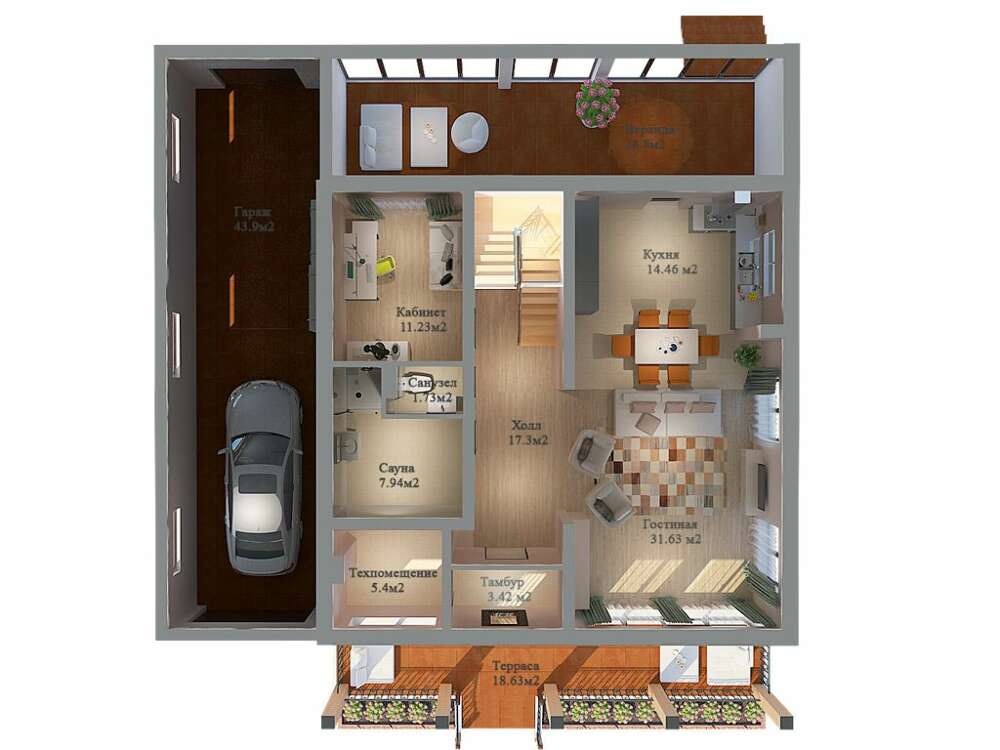 На первом этаже находятся помещения для дневного времяпрепровождения. Основную площадь занимает зал в 47 кв. м., полученный за счет объединения гостиной, столовой и кухни. Помещение имеет выход на закрытую веранду, куда всегда можно перенести трапезу или чаепитие с друзьями. Остальная площадь разделена между просторным холлом, кабинетом, сауной, санузлом и котельной. Гараж в 44 кв. м. позволяет не только свободно поместить автомобиль, но и хранить запчасти, инструмент и легкую технику, например, велосипед, мопед, байк.