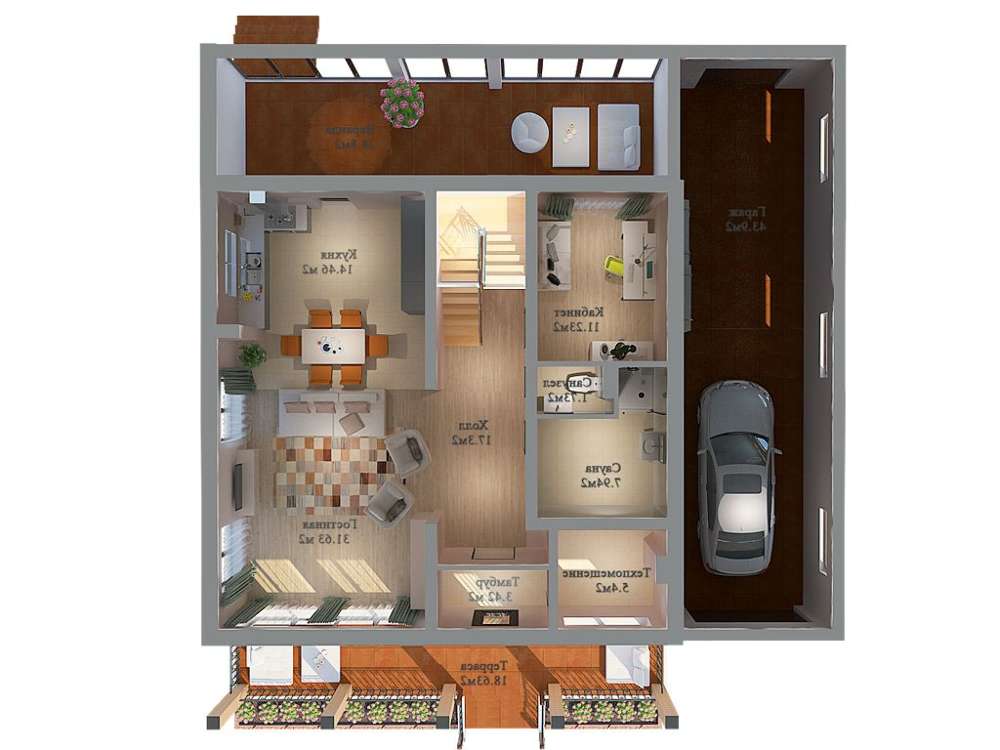 На первом этаже находятся помещения для дневного времяпрепровождения. Основную площадь занимает зал в 47 кв. м., полученный за счет объединения гостиной, столовой и кухни. Помещение имеет выход на закрытую веранду, куда всегда можно перенести трапезу или чаепитие с друзьями. Остальная площадь разделена между просторным холлом, кабинетом, сауной, санузлом и котельной. Гараж в 44 кв. м. позволяет не только свободно поместить автомобиль, но и хранить запчасти, инструмент и легкую технику, например, велосипед, мопед, байк.
