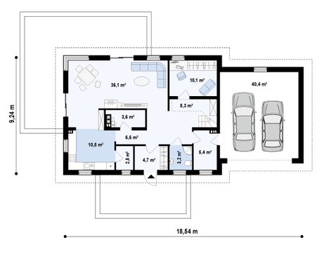 Правую часть дома занимает комната, которая можно использовать как кабинет или спальню, отдельный санузел и подсобное помещение. Кстати, через это помещение можно попасть в гараж на две машины прямо из жилых комнат.