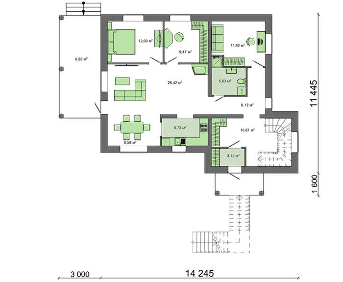 Проект содержит три раздела – АрхитектурныйКонструктивный и Инженерный: водоснабжение, отопление, вентиляция, канализация, электроснабжение (приобретается за дополнительную плату) + Пояснительная записка.