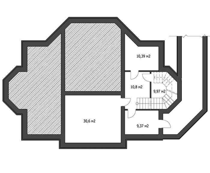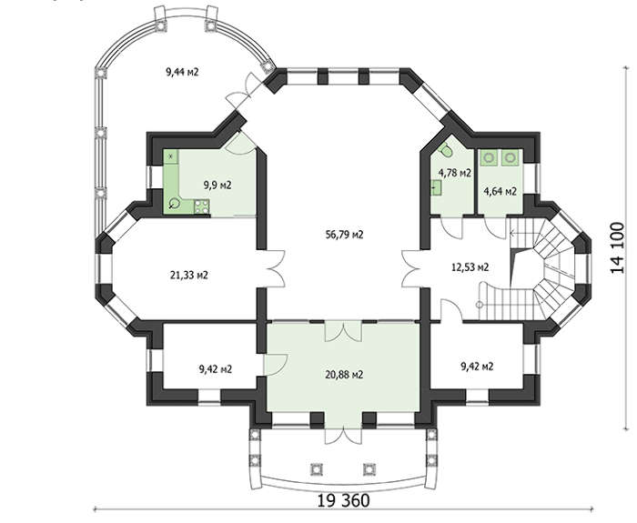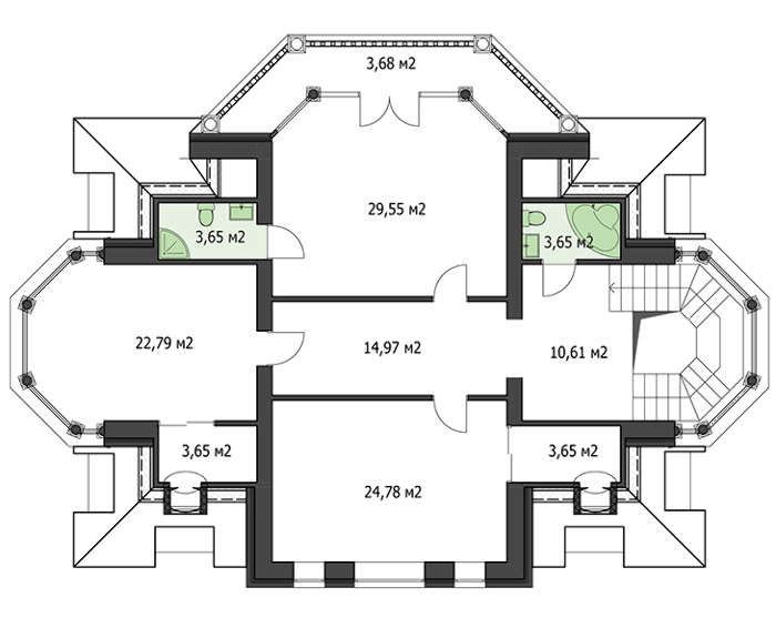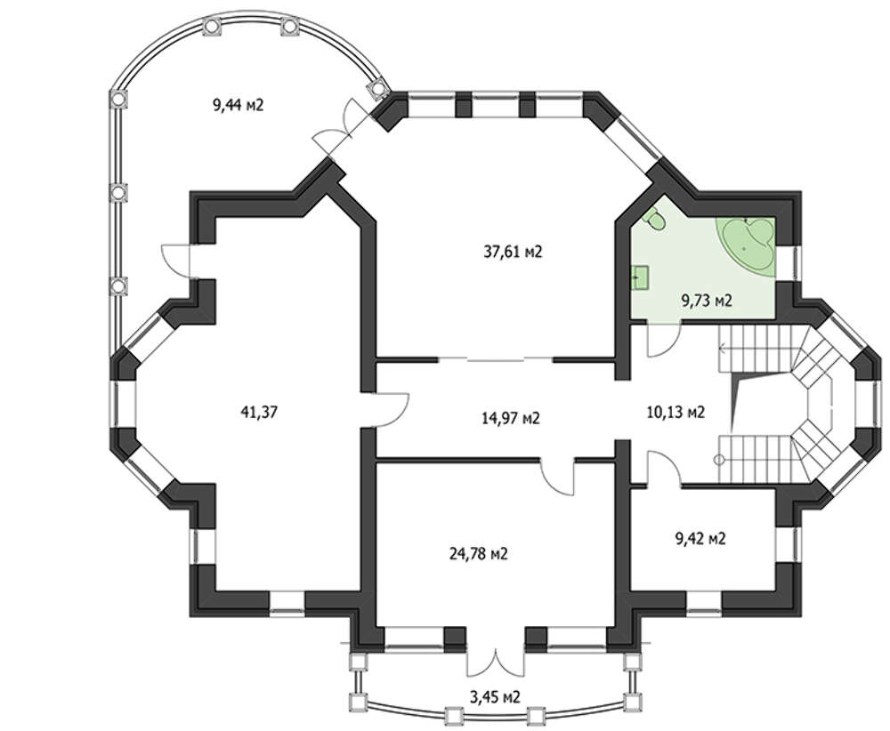 Первый — гостиный. Это большой холл для приемов, банкетный зал и кухня. А также прихожая, гардероб, санузел, прачечная, коридор с лестницей на второй этаж и комната для обслуживающего персонала. Следующий уровень — зона отдыха. Биллиардная, две спальни для гостей, санузел с массажной ванной, гардероб. Завершающий этаж представляет собой личную территорию жильцов особняка. Здесь расположены комфортабельные апартаменты.