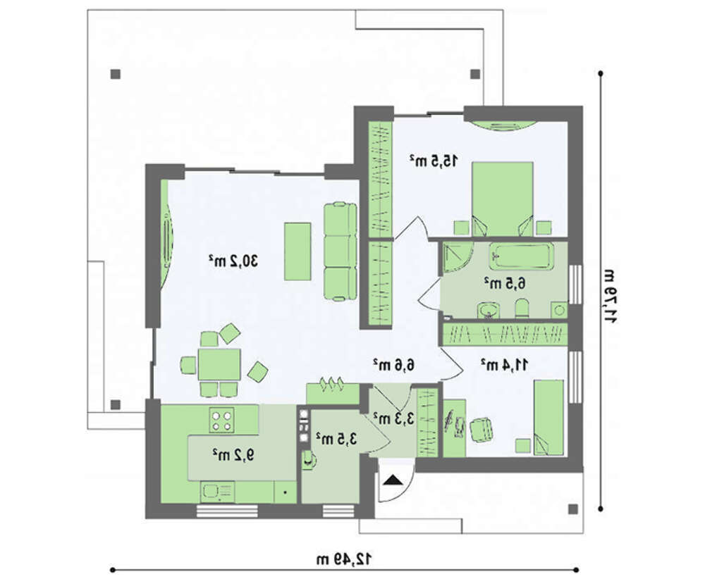 Проект компактного коттеджа прекрасно подойдет для дачного участка. Благодаря оригинальному экстерьеру домик не только впишется в любой ландшафт, но и станет уникальным дополнением пейзажа. Скромные габариты позволят поместить дачу даже на пресловутых 6 сотках, оставив место для гаража, баньки и садовых деревьев.