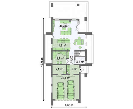 На первом этаже выделено достаточно места для хранения двух автомобилей. Небольшая мастерская поможет выполнять их обслуживание в комфортных условиях. Под быстрый прием друзей и родственников рассчитаны гостевые хоромы. Они в себя вместили кухню, гостиную и столовую, имеют два выхода на террасу. Такой план позволяет хозяйке легко контролировать процесс встречи гостей, накрывать столы и собирать большие компании быстро и нетрудно.