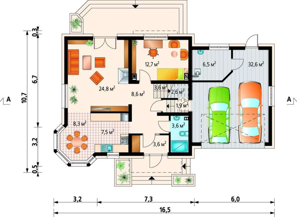 Проект для строительства симпатичного дома с гаражом на 2 авто и угловым эркером