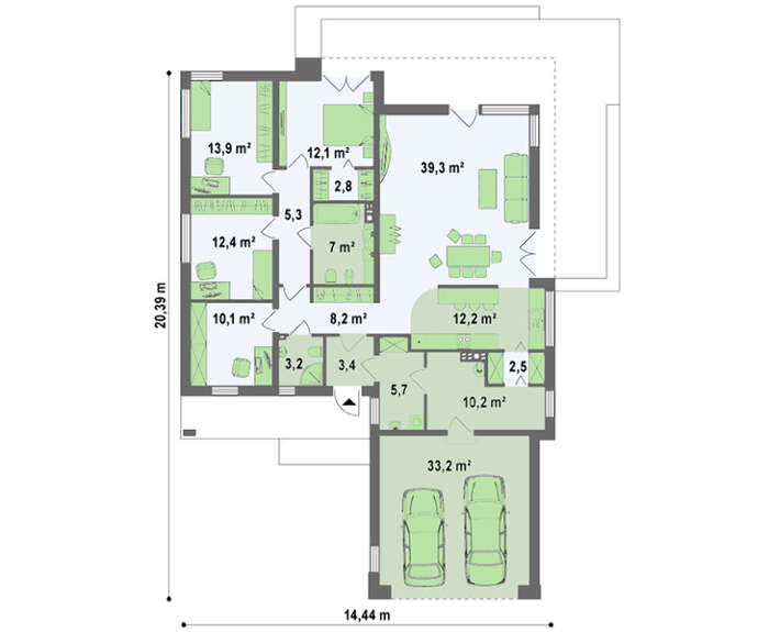 Примыкающий к дому гараж на две машины, отделен от основного пространства дома удобными подсобными помещениями.