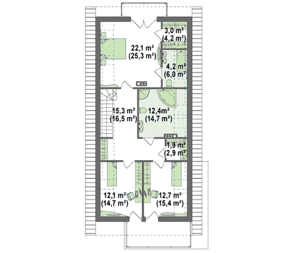 Проект содержит три раздела – АрхитектурныйКонструктивный и Инженерный: водоснабжение, отопление, вентиляция, канализация, электроснабжение (приобретается за дополнительную плату) + Пояснительная записка.