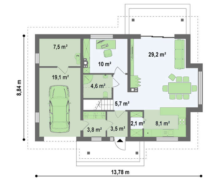 Если взять предыдущую разработку 4M118 и внести некоторые изменения, то мы получим проект дома с гаражом – достойный вариант загородного жилья, рассчитанного на семью из 5-6 человек.