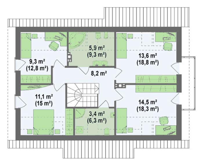 В меньшей степени изменения коснулись мансардного этажа. Единственным отличием от базового проекта стало то, что была увеличена площадь санузла с душевой кабинкой. Это стало возможным за счет того, что проектировщики отказались от гардеробной, расположенной в самой большой спальне.