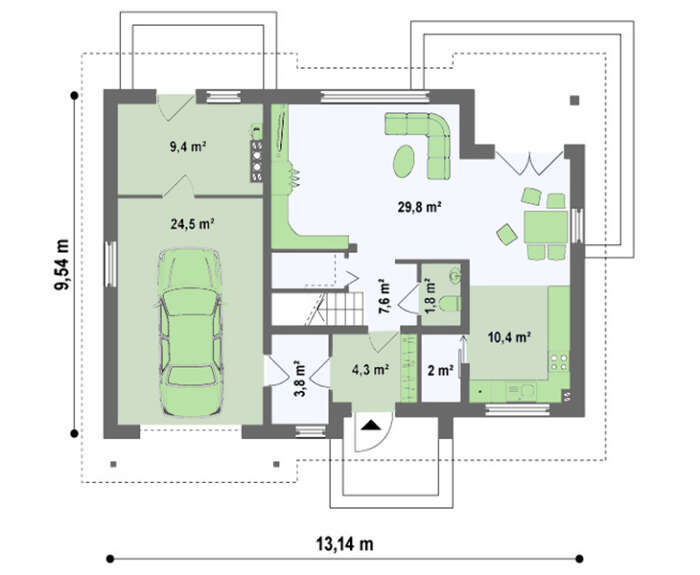 Архитектурный стиль можно определить как современный с характерными чистыми линиями и функциональной композицией. Дом имеет лаконичный объём, дополненный мансардной крышей с уклоном 38° и выдержанными пропорциями. Фасад выполнен в светлой цветовой гамме: мягкие бело–пастельные оттенки подчёркивают грани конструкции и придают визуальную лёгкость. Такой выбор цвета не только эстетичен, но и впишется в любой ландшафт – от загородной зелёной зоны до современного коттеджного поселка.