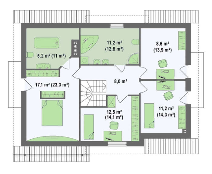 Мансардный этаж включает две светлые спальни и ещё один санузел — идеальный вариант для детей или гостей. Планировка продумана так, чтобы каждый член семьи получил комфортное личное пространство.