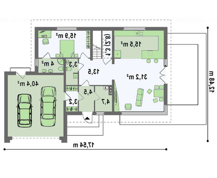 Проект дома с мансардой, гостиной и гаражом на две машины