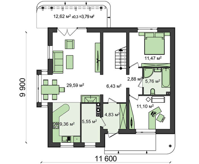 Проект содержит три раздела – АрхитектурныйКонструктивный и Инженерный: водоснабжение, отопление, вентиляция, канализация, электроснабжение (приобретается за дополнительную плату) + Пояснительная записка.