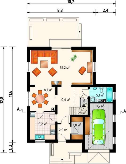 Размещенный под крышею дома гараж позволяет жильцам в удобных условиях обслуживать автомобиль. Для приема приятелей и родственников в проекте предусмотрены большие площади. Все помещения: кухня, гостиная и столовая выделены в отдельные комнаты, не мешают друг другу, при этом находятся рядом, что позволяет легко подвигаться между ними, стряпать лакомые яства, сервировать торжественные обеденные столы, веселиться, вести величественные разговоры и наслаждаться присутствием в славной компании. Такому времяпровождению помогает отдельный выход на загородный участок, добавляющий в отдых характерную частному жилью свободу.