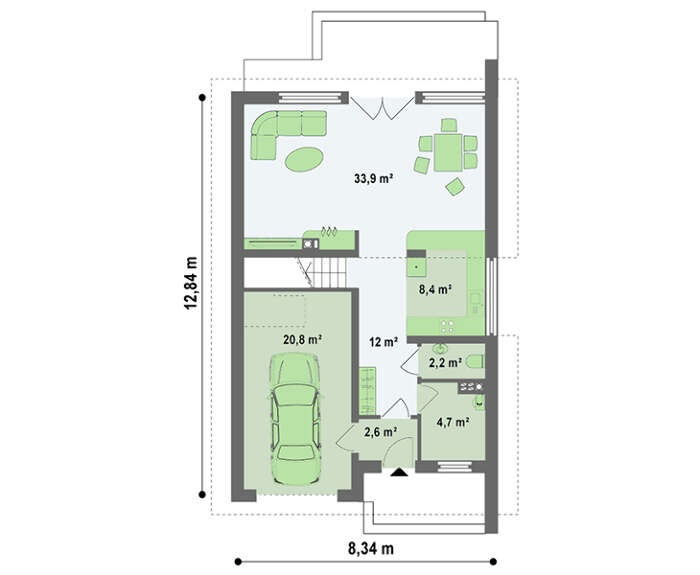 Валик, здравствуйте! Данный проект предназначен больше для узкого участка. Где нет возможности обустроить гараж или навес для машины вне дома. Одна стена (без окон) с расчётом так же на узкий участок, чтобы окна не выходили "в забор" или "дом соседа". Хоть и количество окон в проекте не большое, но они все витражные (в пол), поэтому естественного освещения будет не так уж и мало.