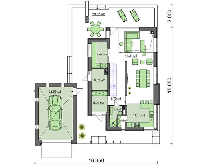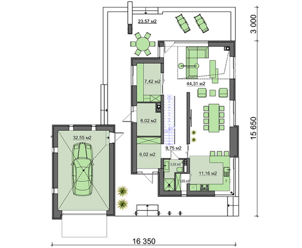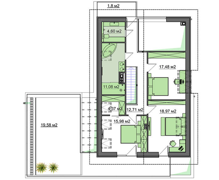 Проект содержит три раздела – Архитектурный, Конструктивный и Инженерный: водоснабжение, отопление, вентиляция, канализация, электроснабжение (приобретается за дополнительную плату) + Пояснительная записка.