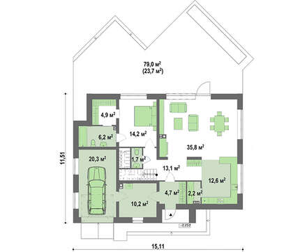 Проект содержит три раздела – АрхитектурныйКонструктивный и Инженерный: водоснабжение, отопление, вентиляция, канализация, электроснабжение (приобретается за дополнительную плату) + Пояснительная записка.