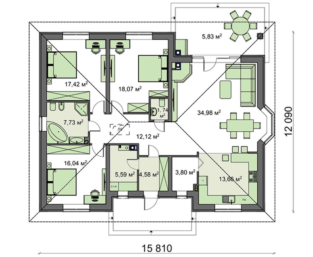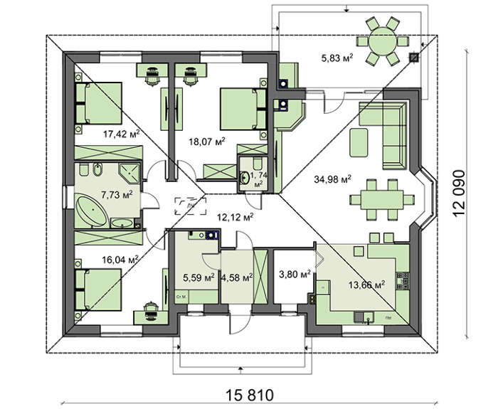 Проект одноэтажного дома площадью 141 кв.м.