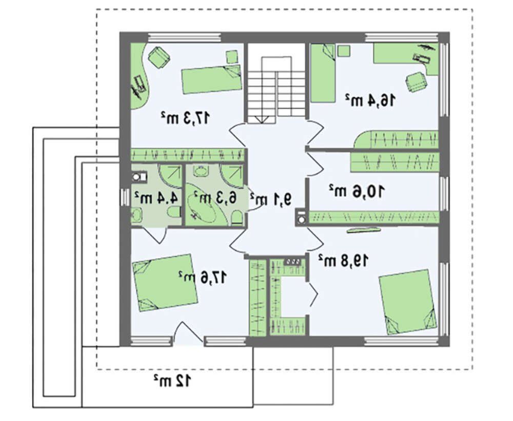4M584 Проект дома с террасой над гаражом. Хороший проект. Редкий случай сочетания строгой простоты и удобства для проживающих. Ему бы крышу в китайском стиле. Был бы интересней и смотрелся бы легче. По планировке есть несколько вопросов. Возможно ли увидеть поэтажный план с размерами внутренней планировки для подготовки предложения по изменению проекта. Изменится ли стоимость приобретения полного пакета документации после внесения изменений в проект? Каков будет срок подготовки всей документации?