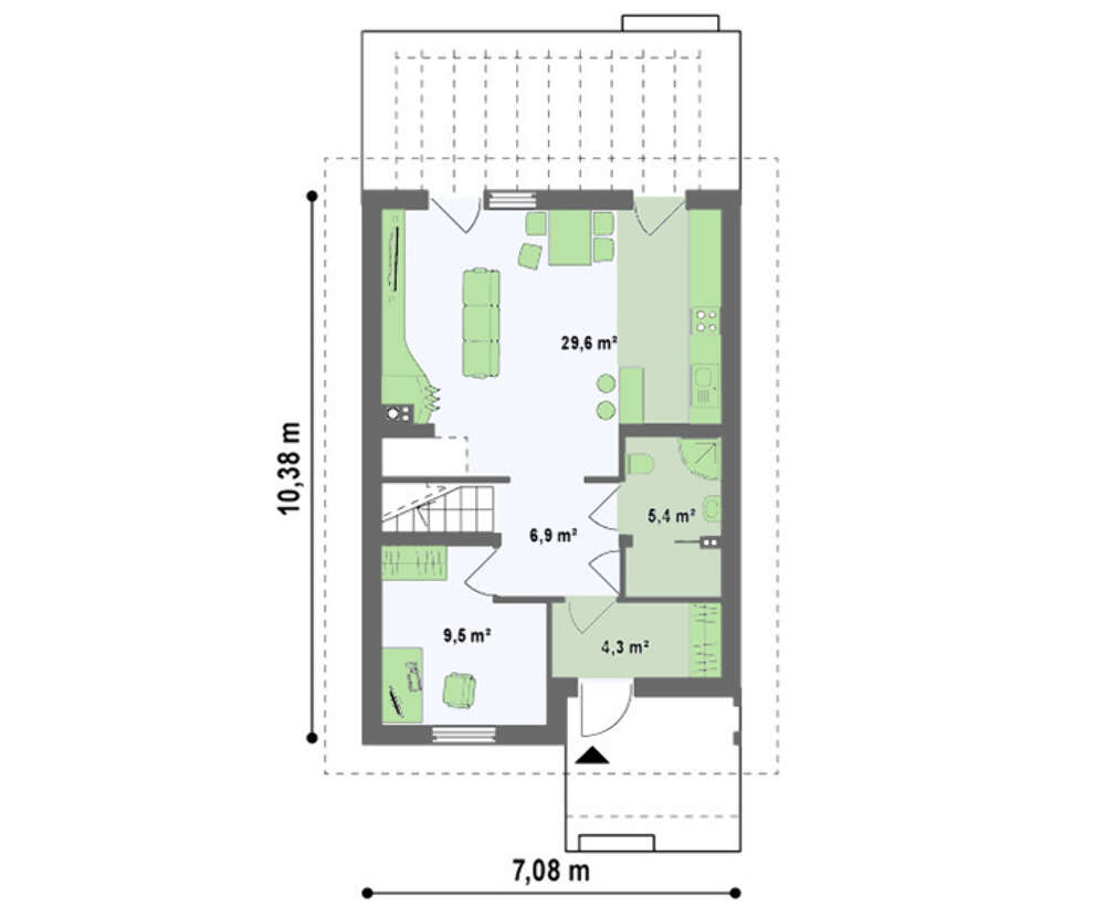 Проект содержит три раздела – АрхитектурныйКонструктивный и Инженерный: водоснабжение, отопление, вентиляция, канализация, электроснабжение (приобретается за дополнительную плату) + Пояснительная записка.