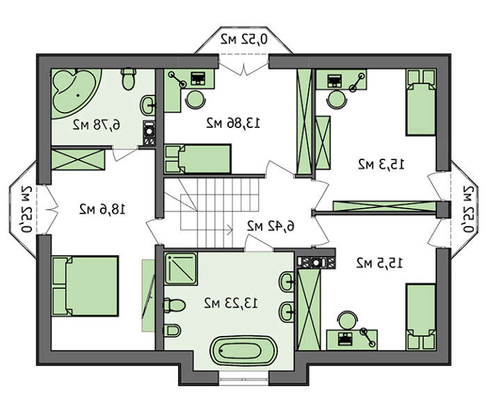 Второй этаж — это личное пространство членов семьи. Оно включает апартаменты владельца дома с собственной ванной комнатой и балконом. Три другие спальни одинаковы по размеру и имеют выход на свежий воздух. На этаже есть общий санузел и небольшой холл.