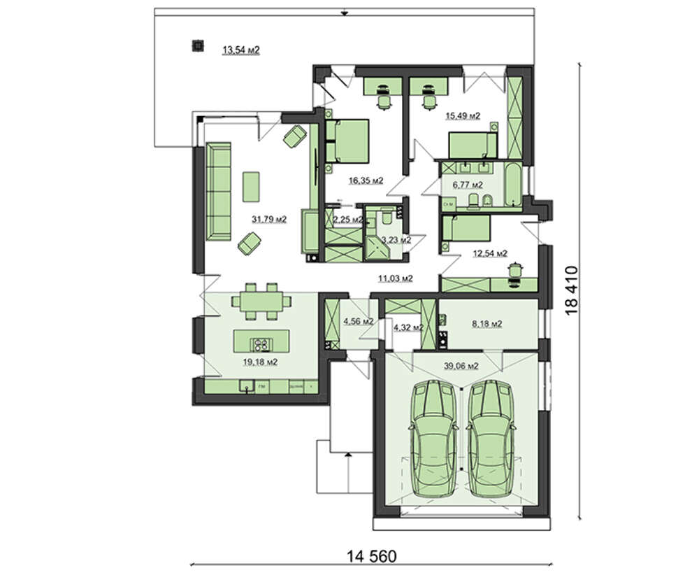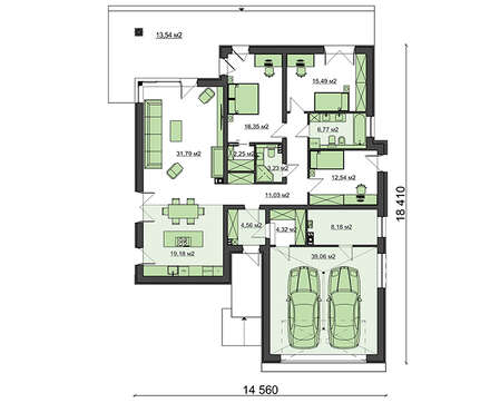 Лаконичность и четкость архитектурных линий подчеркивают изящество одноэтажного дома в стиле модерн с гаражом на две машины. Сдержанные тона внешней отделки и плоская крыша дополняют его современный вид.