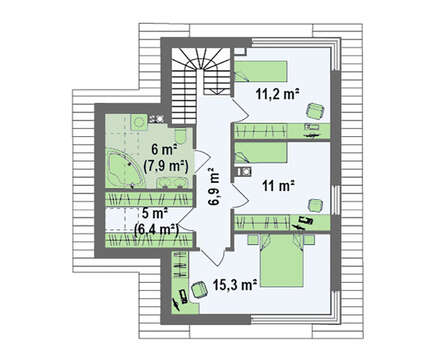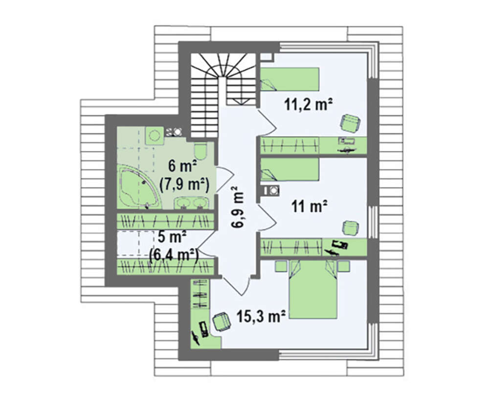 Вообще, стоит отметить, что большое количество окон – это отличительная особенность проекта. Через угловые окна на втором этаже солнечный свет беспрепятственно попадает в комнаты, наполняя их теплом и уютом. Три спальни в мансарде дополняют просторная ванная, совмещенная с прачечной и вместительная общая гардеробная.