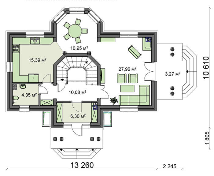 Обеденный стол удачно размещен в эркере со вторым светом. Члены семьи и их гости во время трапезы смогут любоваться пейзажем усадьбы. Место для приготовления пищи отнесено в дальний угол. Поэтому запахи еды или процесс сервировки не помешают разговорам в зоне отдыха.