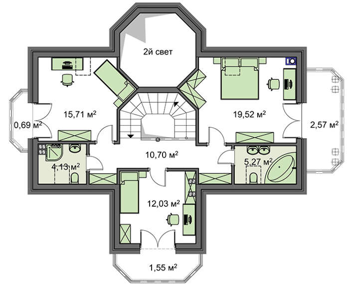 На втором этаже находятся личные комнаты жильцов дома. Это просторных спальни с балконами, на которых можно выпить чашечку утреннего кофе, наслаждаясь пением птиц, или полюбоваться багряным закатом. На верхнем уровне расположены два санузла. Один с душевой кабиной, а другой с массажной ванной.