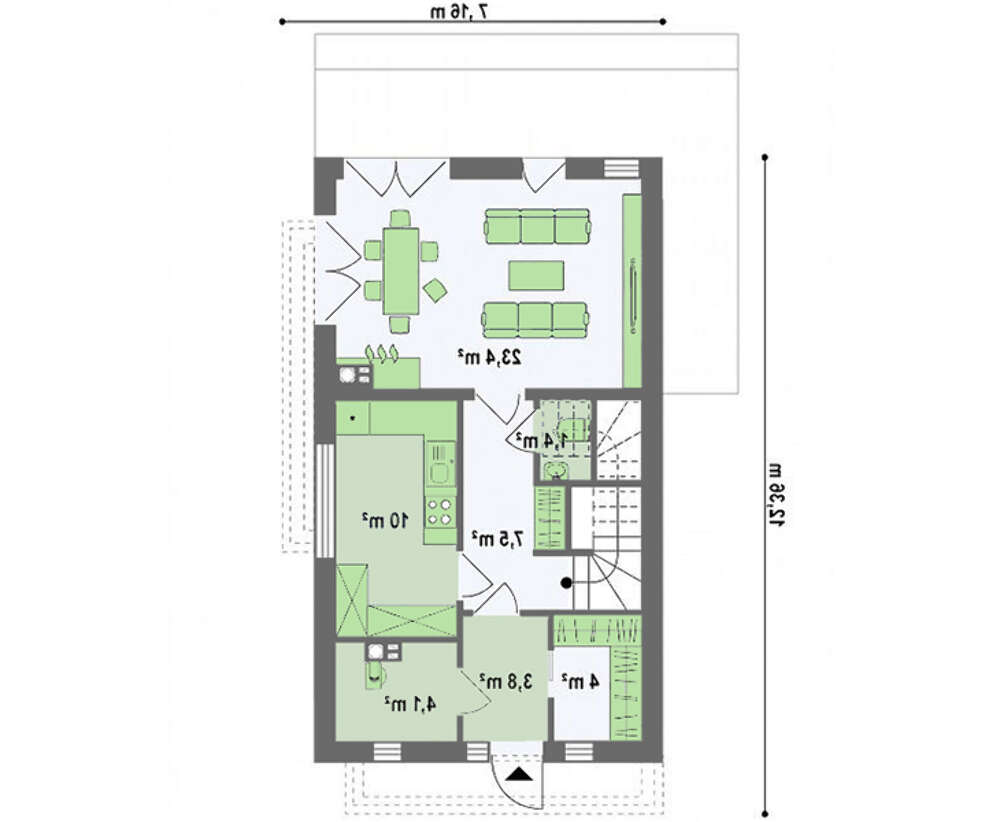 Красивейший компактный коттедж в стиле минимализма придется по душе застройщикам, предпочитающим яркую современную архитектуру. Небольшие размеры дома позволяют поместить его на миниатюрном, в том числе и узком, участке в пресловутых 6 соток. Проект рассчитан на проживание семьи 3-4 человек. Он популярен как в дачном, так и коттеджном строительстве.