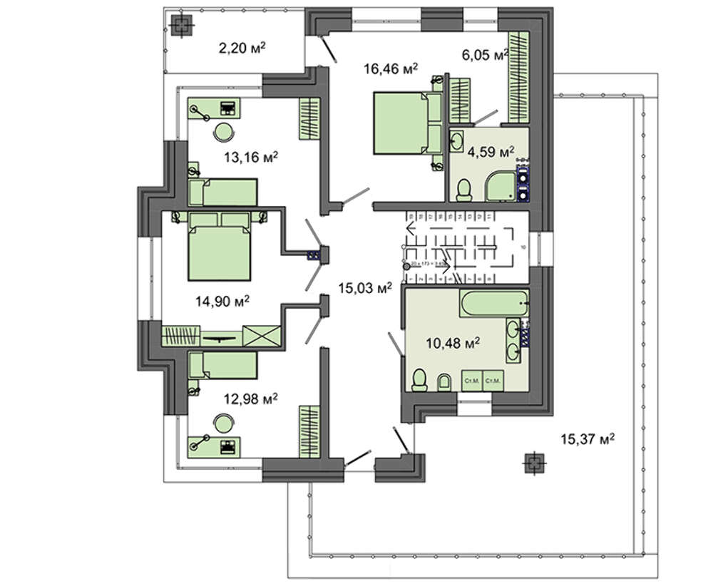 Верхний уровень включает апартаменты хозяина с собственным гардеробом, балконом и санузлом и три уютныхе спальни одинаковой площади. На этаже находится общая санитарная комната с массажной ванной и просторный холл в 15 кв. м.