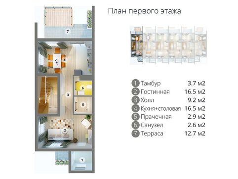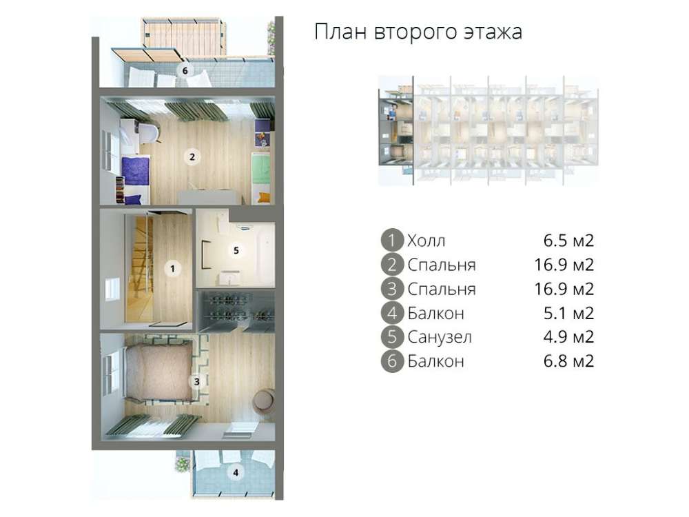 Остальное пространство этажа занимает удобный холл с лестницей наверх, совмещенный санузел и прачечная. На втором уровне находятся две просторных спальни по 17 кв. м. с балконами и ванная комната с душевой кабиной. Остальные квартиры аналогичны по площади и планировке.