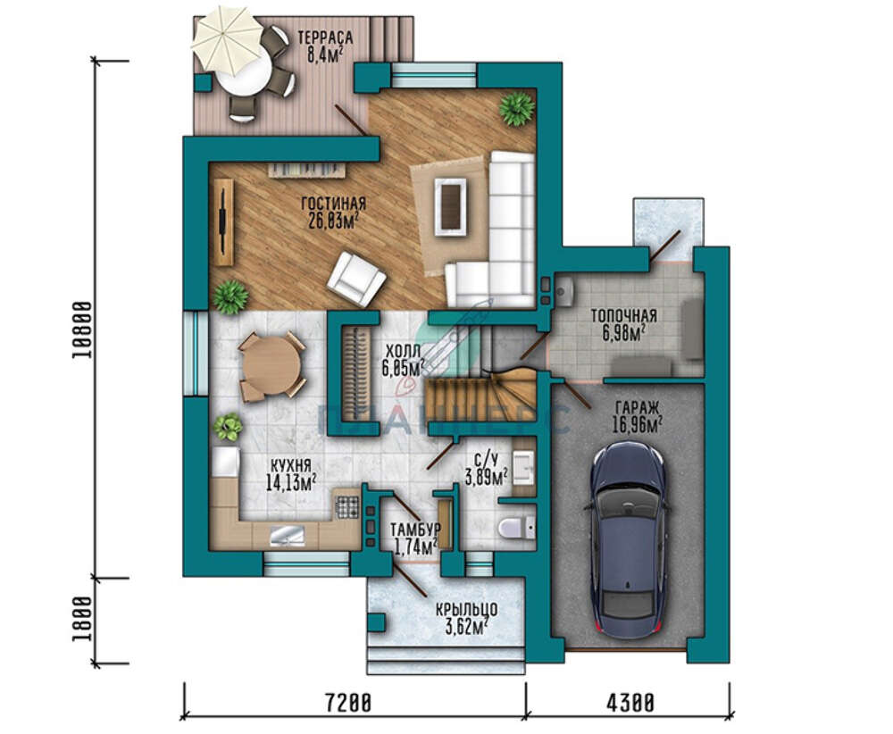 Внутреннее пространство рационально поделено на помещения. Площадь в 161 кв. м позволяет вместить все необходимые помещения для проживания среднестатистической семьи. На первом этаже расположен большой гостиный зал в 26 кв. м и кухня, выполняющая роль столовой. Перегородок нет, что позволяет почувствовать простор и свободу. Места достаточно, чтобы встречать друзей, устраивать званые обеды или фуршеты. Функцию разграничения помещений выполняет ниша со шкафом-купе, она делит комнату на зоны, ограждает холл с лестницей. На остальном пространстве находится прихожая и санузел.