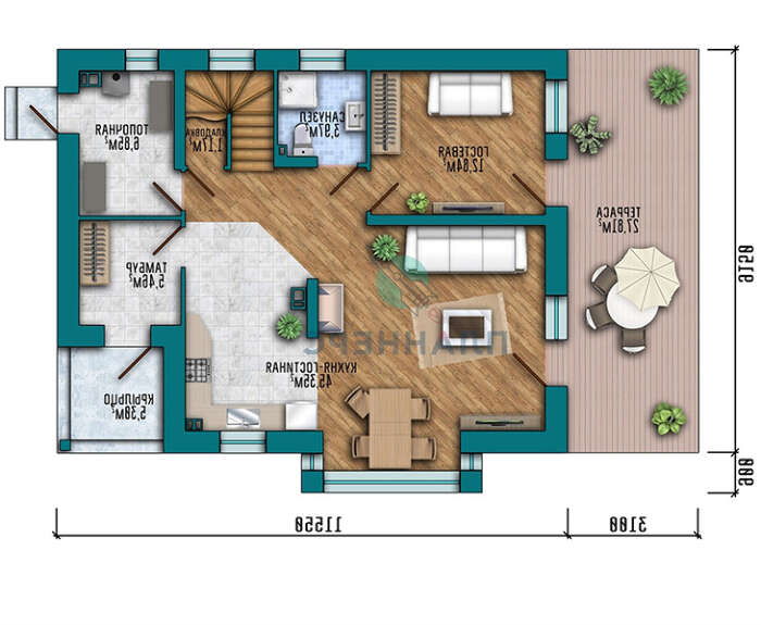 На первом этаже гостиная зона. Она включает просторный зал с камином и банкетным столом в эркере. Место для приготовления пищи находится в этом же помещении. Примыкающая комната используется как спальня для гостей или для родственников старшего поколения. На оставшейся площади разместилась прихожая и котельная. Последняя имеет отдельный выход, что очень удобно.