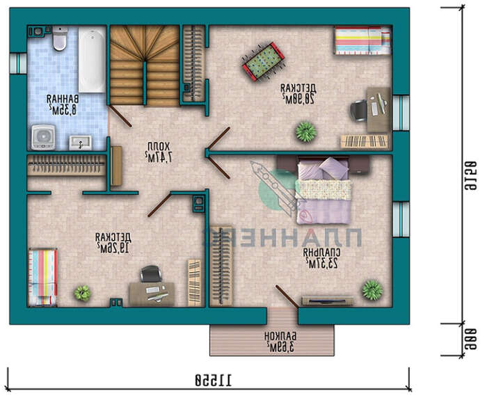 На втором этаже личная территория жильцов дома. Она включает спальню хозяина с балконом, две детских комнаты, санузел и холл.
