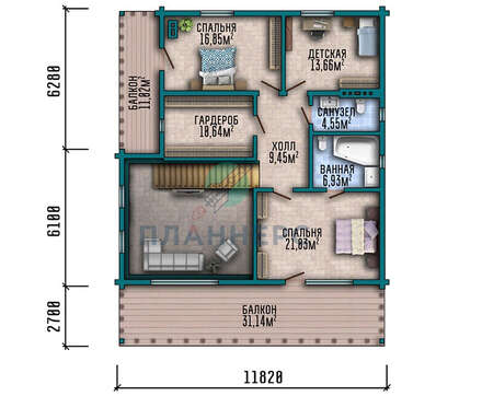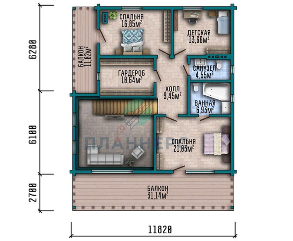 В другой части уровня расположилась спальня для гостей в 15 кв. м и подсобные помещения, из которых стоит выделить котельную и огромный гардероб. На верхнем уровне разместилась спальня с балконом, детская, санузел, апартаменты владельца дома с собственной ванной комнатой и просторной лоджией.