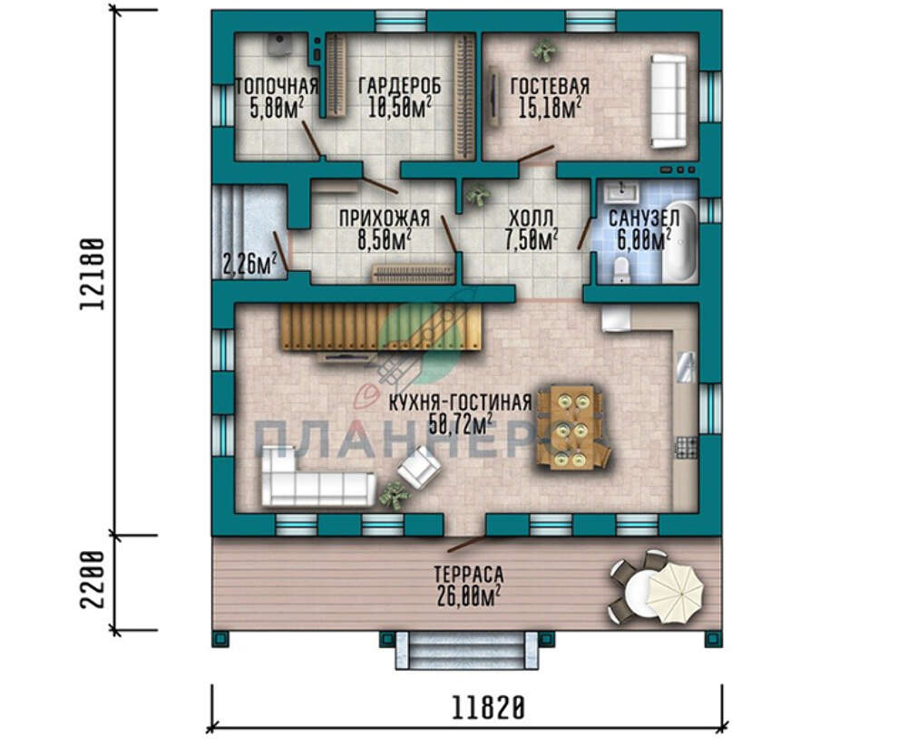 Для стен первого этажа используется не дикий камень, а ячеистый бетон, впоследствии покрытый специальными смесями. В этом случае уже не нужен мощный фундамент. Второй этаж деревянный, стены изготовлены из клееного бруса. Прикрывает коттедж пологая кровля из керамической черепицы с более чем на метр выступающими скатами.