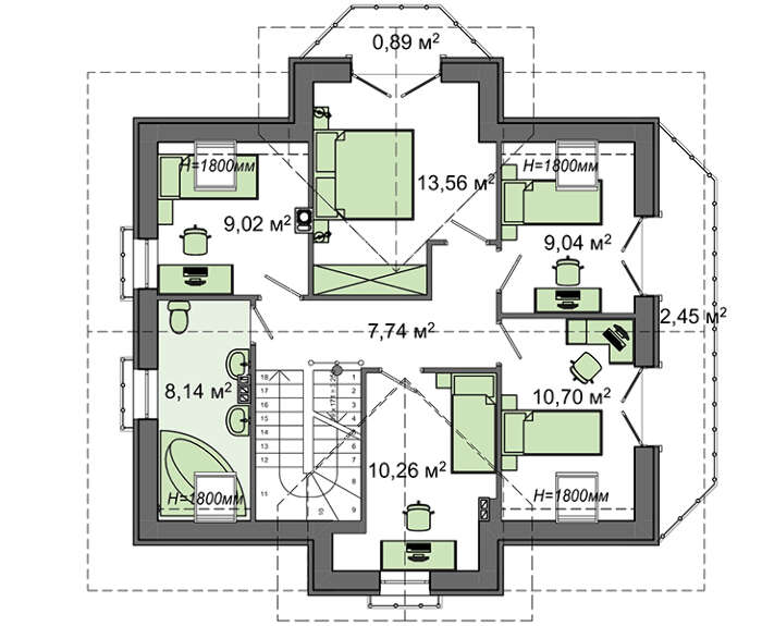 Второй этаж — это территория сна. Здесь господствуют спальни. Их пять, по количеству членов семьи. Три имеют выход на балкон, где жильцы могут устроить свой фитнес-зал, место для творчества или летний бар для курящих. Два французских балкона позволяют впустить в помещение в два раза больше света и свежего воздуха, нежели через окно. Для любителей комнатных растений — это просто удача. На таком балконе можно разместить вазоны с цветами. Верхний уровень обустроен совмещенным санузлом с массажной ванной. Остальную площадь этажа занимает небольшой коридор, обеспечивающий свободный доступ к отдельным комнатам.