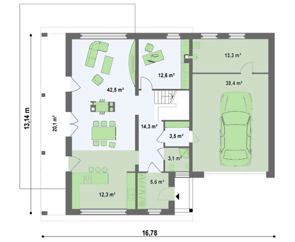 Проект двухэтажного современного коттеджа с террасой и гаражом