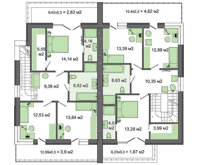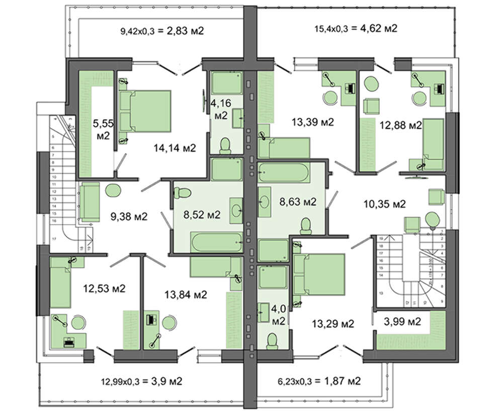 Второй этаж каждой квартиры включает по три личных помещения, среди которых выгодно выделяются спальни повышенной комфортности. Каждая состоит из трех комнат, включают гардероб и санузел. В состав всех личных помещений входит балкон.