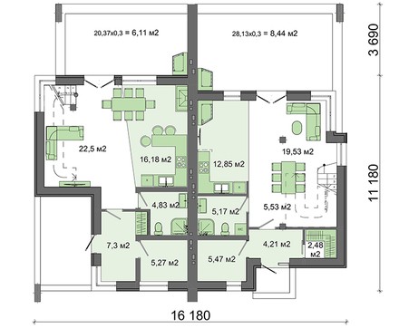 Обратите внимание, что две части таунхауса имеют различную планировку и позволяют каждой семье подобрать ту, которая более соответствует стилю жизни и интересам. Большая часть первого этажа отводится гостиным, в обоих квартирах они получены при объединении с кухней и столовой, занимают большую площадь. Помещения имеют выходы на террасу, где можно обустроить мангал и проводить дружеские встречи с шашлыками. Терраса разных квартир разделены стеной, что гарантирует приватность личной жизни семьи. Под санузел и гардероб выделены отдельные комнаты.