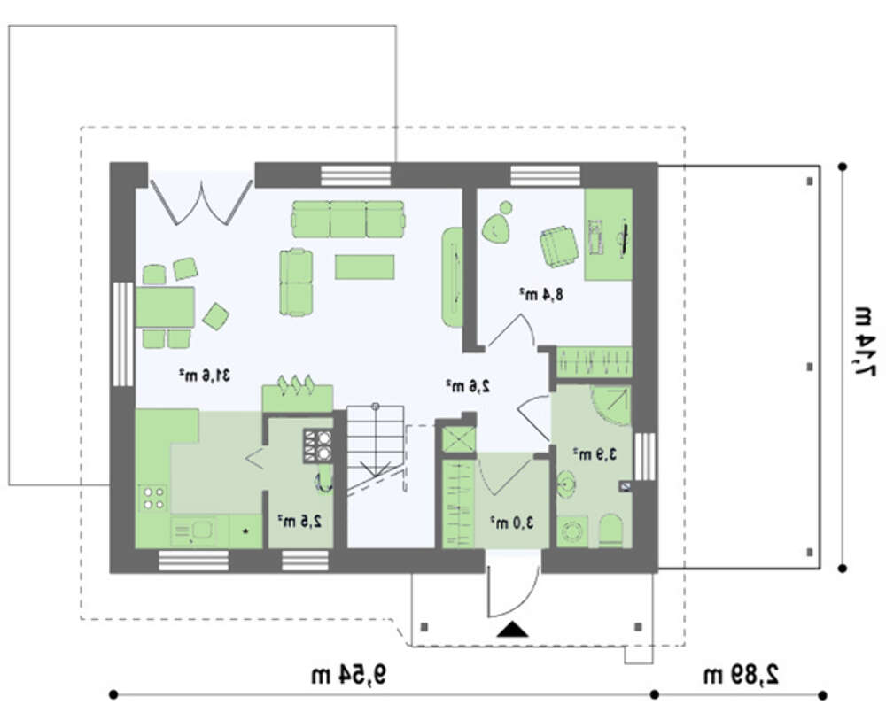 • 4M198 Проект недорогого дома площадью 100 кв.м. с навесом для 1 автомобиля