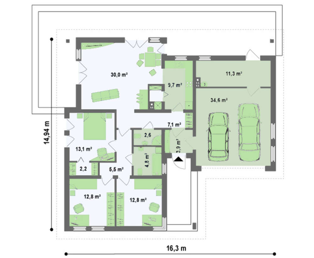 Проект функционального одноэтажного коттеджа с гаражом для 2 автомобилей