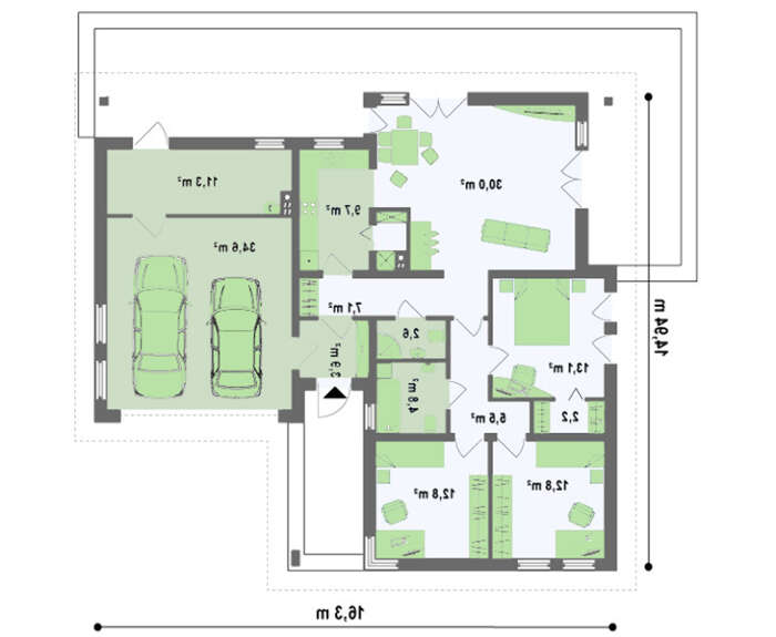• 4M174 Проект функционального одноэтажного коттеджа с гаражом для 2 автомобилей